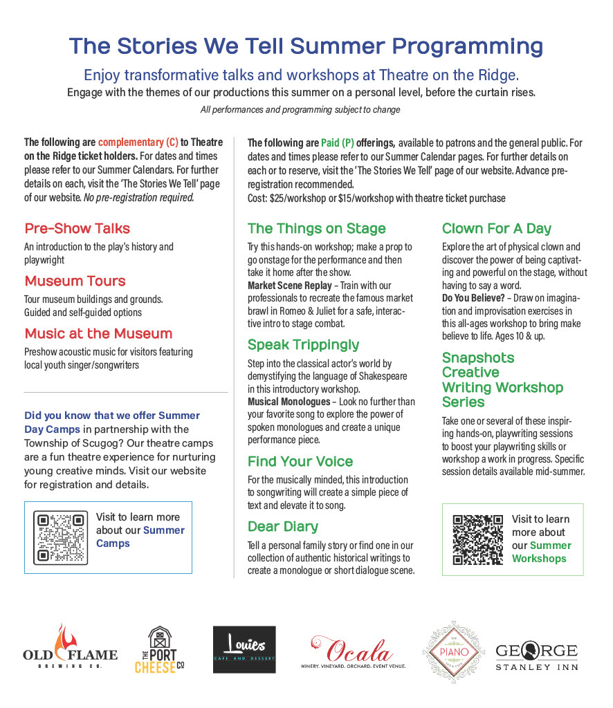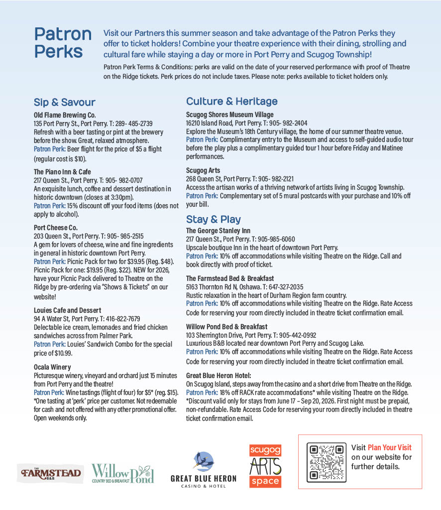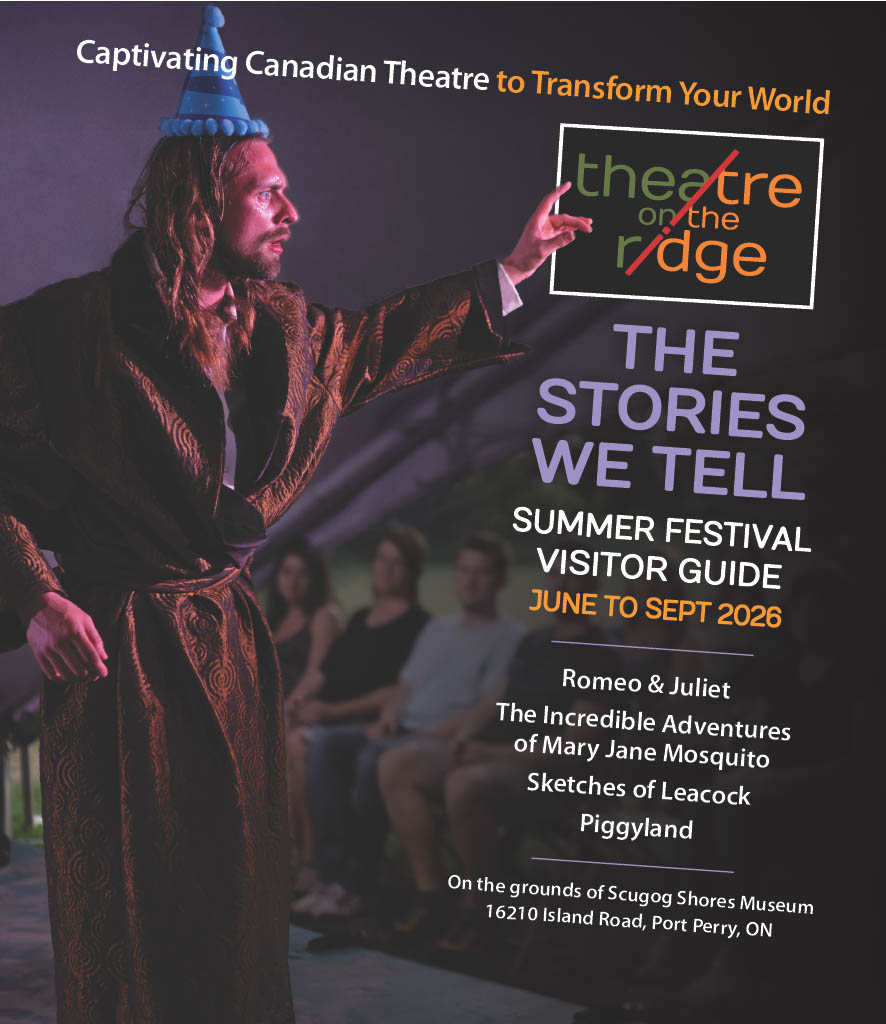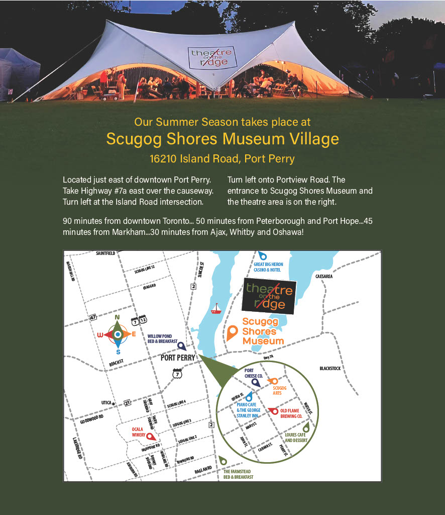 Theatre on the Ridge is a not for profit professional theatre company performing throughout the year in Port Perry, Scugog Township and the Durham Region. Our annual Summer Festival takes place on the grounds of Scugog Shores Museum Village, just east of Port Perry.