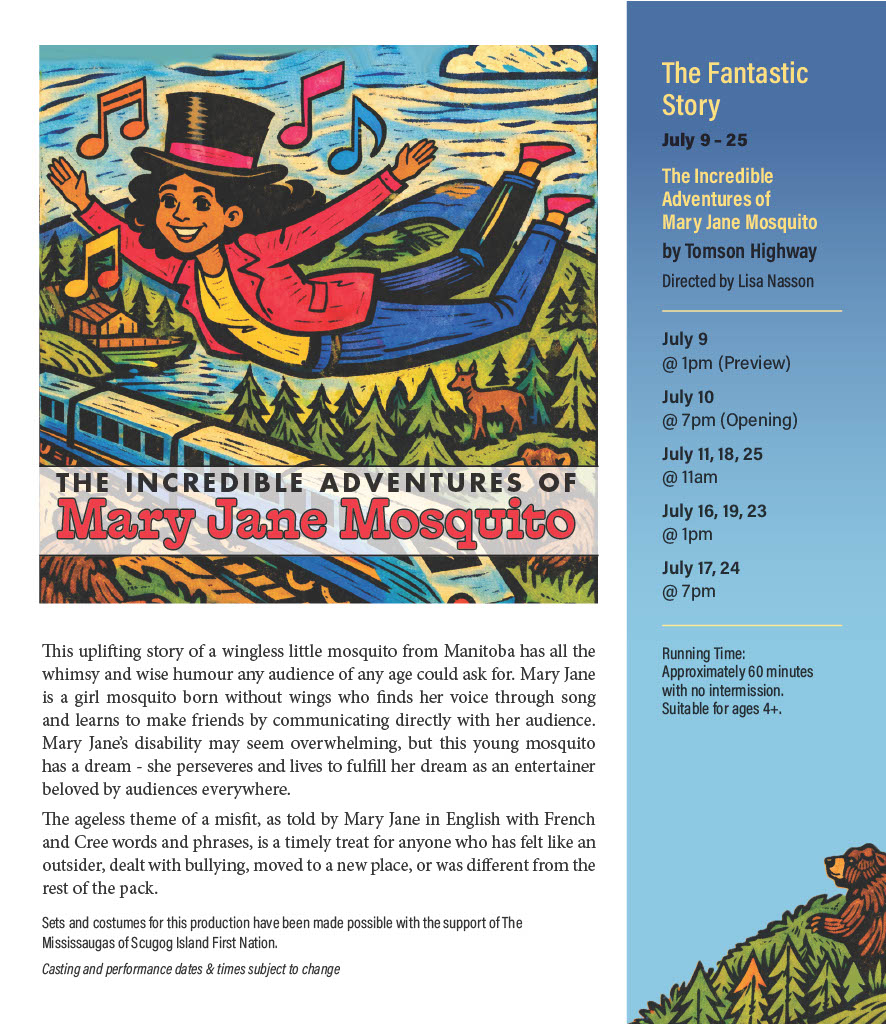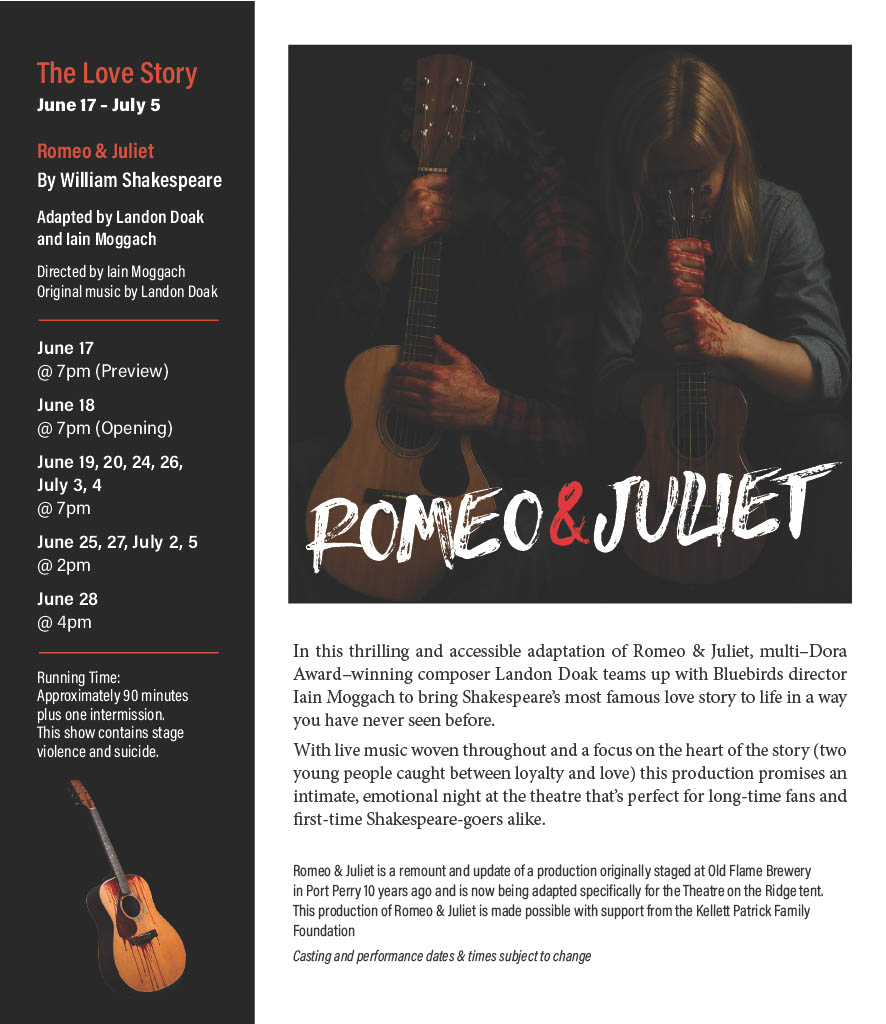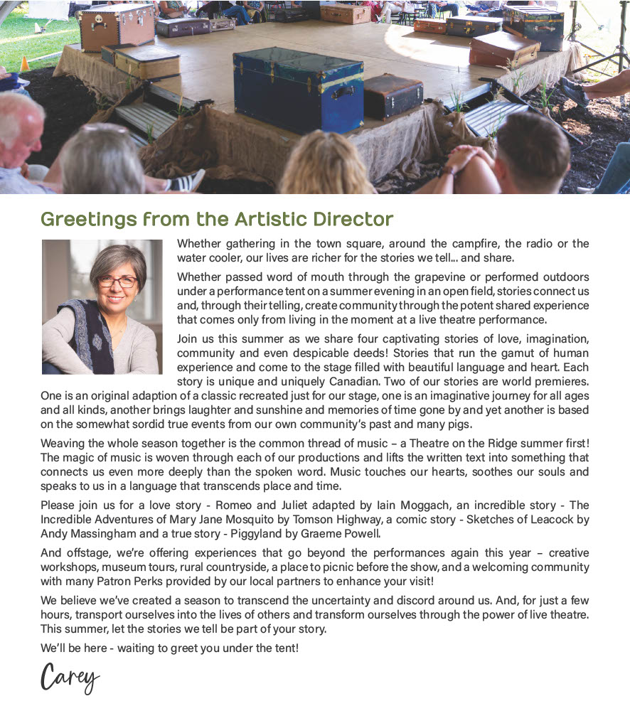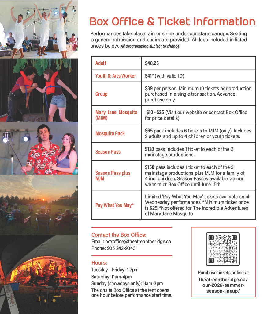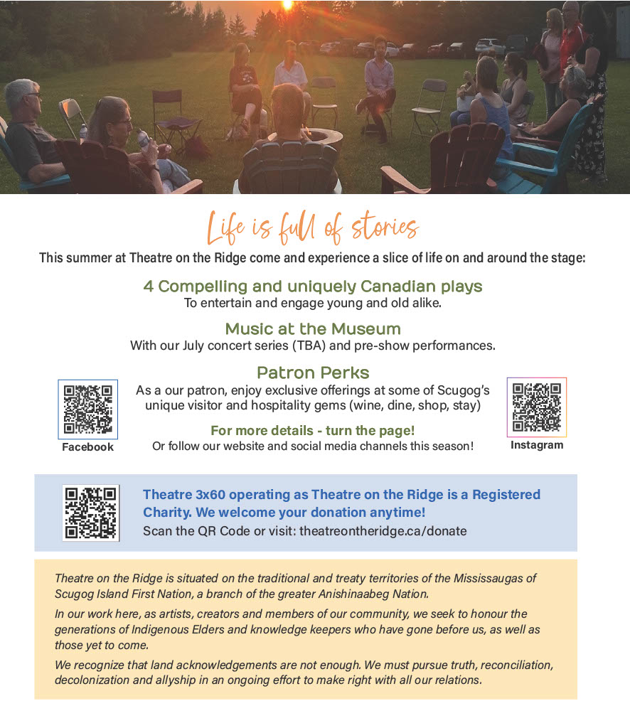 Theatre on the Ridge acknowledges that we are situated within the Williams Treaties and the traditional territories of the Mississaugas, a branch of the greater Anishinaabeg Nation, which includes the Algonquin, Ojibway, Mississauga, Chippewa, Odawa, Delaware and Potawatomi peoples.