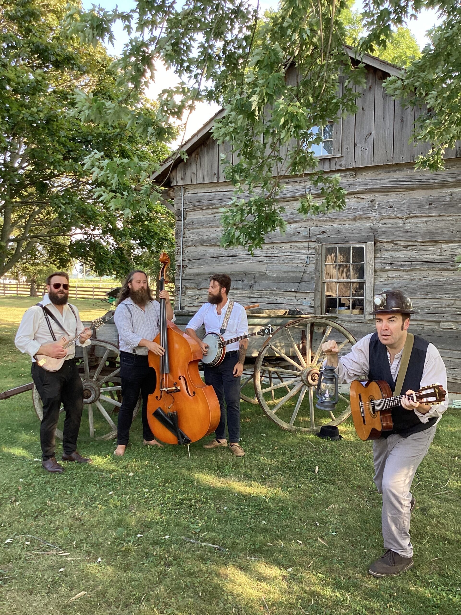 From L-R : Troy Williams on mandolin, Jonathan Sloan on upright bass and Adam Till on banjo. In front is playwright, composer, narrator singer-songwriter Will Gillespie on guitar wearing the genuine antique hard hat worn underground in the gold mines of Northern Ontario.